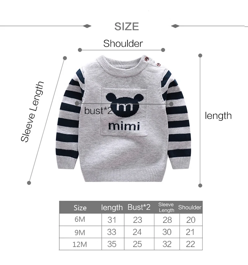 Please compare the detail size with yours before you buy ! Item Name :Baby Boys Sweater Color: Gray / Green / Red /Purple Size: 6M 9M 12M For Season :Spring Autumn Winter