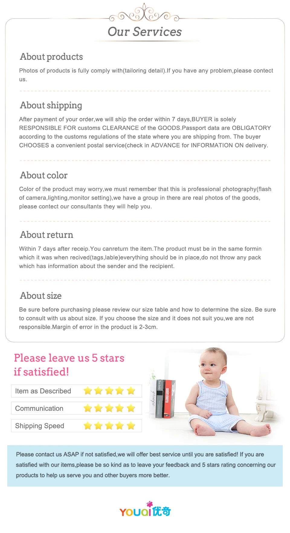 3. When you play an order to us, please leave your detailed personal information as full name, completed address, zip code and connect phone number to ensure you can receive your packages timely.​ F A Q : Q: How should I choose the right size? A: You can refer to our size chart, choose according to height and weight of the baby’s size, if you are not sure, please contact us to recommend the right size for you. Q: Are the clothes photos real? A: We guarantee that all of our products pictures are taken in kind, similarity was over 90%. But there will be little color difference due to different monitors and lights. If you are doubt with our products, please contact us to confirm it. Q:How about the quality of the clothes? A:We will check the goods carefully before shipping and we try our best to make sure the clothes are good. Though it is possible with small threads,dust or odd sizes. We do affordable kids wear not luxury. Please think twice before your order. Q:How long I can get my order ? A:The shipping time depends on the way of logistics and the country. And the holiday also can affect the shipping time.So the following logistics time is just for reference.If there is any problem, welcome to contact us. Q: What if the clothes I received with some problems,can I get my refund? A: Yes, of course. When you find clothes have any questions, please contact us in time. You can contact us through the stand inside letter, we will give you a satisfactory processing as soon as possible.