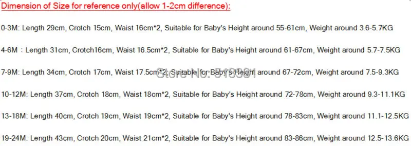 Size: 3M, 6M, 9M, 12M, 18M, 24M. Pleae choose one or two size larger than actual of your baby because there is measurement difference and 1-2 months shipping time on the way.