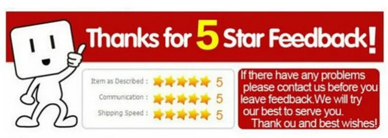 Your satisfaction and positive feedback is very important to us.Please leave positive feedback and 5 stars if you are satified with our items and services.If you have any problems with our items or services,please feel free to contact us first before you leave nagative feedback.We will do our best to solve any problems and provide you with the best customer services.