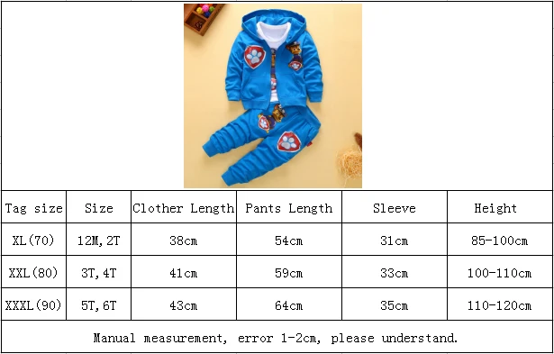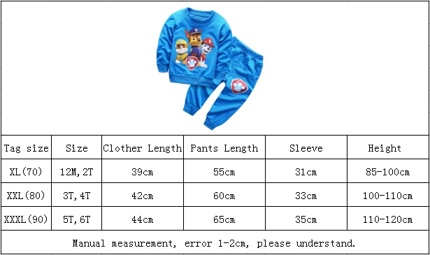 Material:cotton+polyster Color:as the photo show Features:Cartoon characters,comfortable material Washing way:both machine washing and hand washing Package:1pcs boys clothing set(1pcs opp bag) Season:spring+autumn+winter Size information: There will be only little color difference due to different monitors and light,please understand this, thank you so much. please contact us if any question