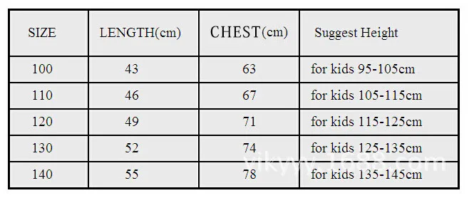Size Chart,it has 1-2 cm error Product Size Height Length Bust Age 3T 90cm 39cm 56cm 2 years 4T 100cm 42cm 60cm 2-3 years 5T 110cm 45cm 64cm 3-4 years 6T 120cm 48cm 68cm 5-6 years 7T 130cm 51cm 72cm … Read More