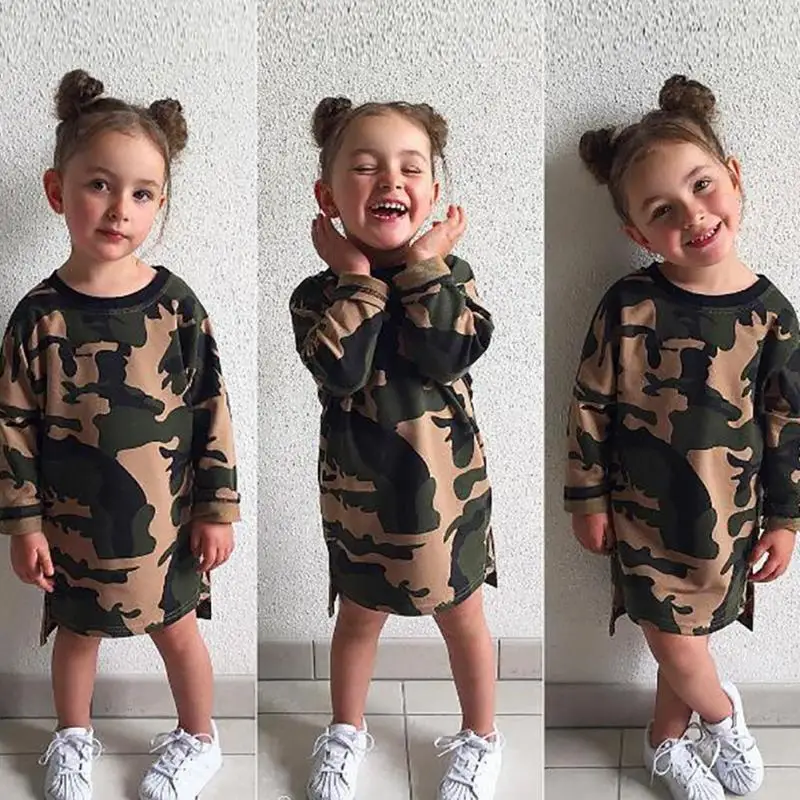 Kids Baby Girls Autumn camouflage long sleeve sweatshirt mini dress Item:sweatshirt Color:Camouflage Sleeve Style: long Gender:Girls Material :polyester Size:90cm 100cm 110cm 120cm 130cm 90 Bust(cm/inch)58/22.83 Length(cm/inch)45/17.72 Age1-2T 100 Bust(cm/inch)60/23.62 Length(cm/inch)47/18.50 Age2-3T 110Bust(cm/inch)62/24.41 Length(cm/inch)49/19.29 Age3-4T 120Bust(cm/inch)64 /25.20 Length(cm/inch)51 /20.08 Age4-5T 130Bust(cm/inch)66 /25.98 Length(cm/inch)53 /20.87 Age5-6T Package included: 1 x sweatshirt 1. Differences due to light and display, the color of the item may be slightly different images. 2 Please allow 1-2cm differs due to manual measurement