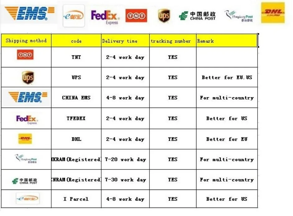 Shipping | EMS, UPS, DHL, China air post, China post air mail also supported to Russia,Turkey,Brazil.ect |