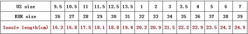 Please notice that the size above is inner length. And there maybe 0-1cm error due to the measure by hand. The size you need=length of your child’s feet+1~2cm Please choose the bigger size for the children’s feet grow very fast, and we need some time to ship to you by China post air.