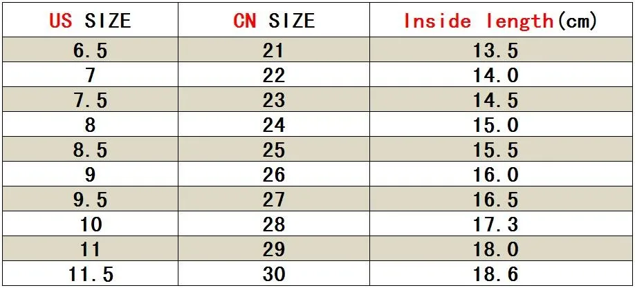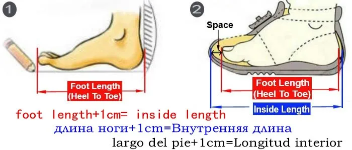 Foot length+1cm=inside length. Such as Pls measure your kid’s foot length as below.IF her/his foot length is 11.5cm,you can add 1cm.That’s to say,choose inside length 12.5cm.Thank you for your support.