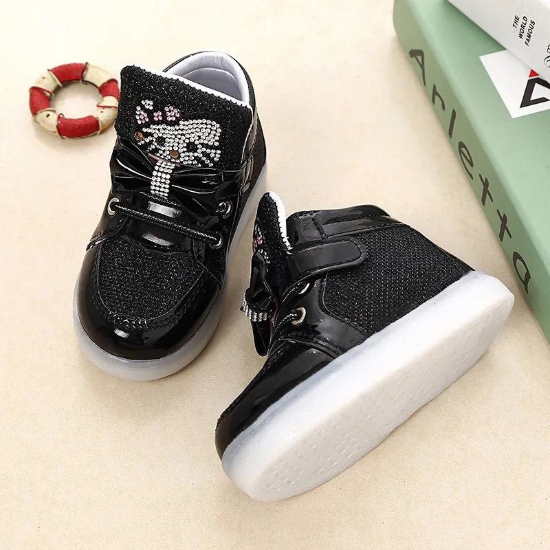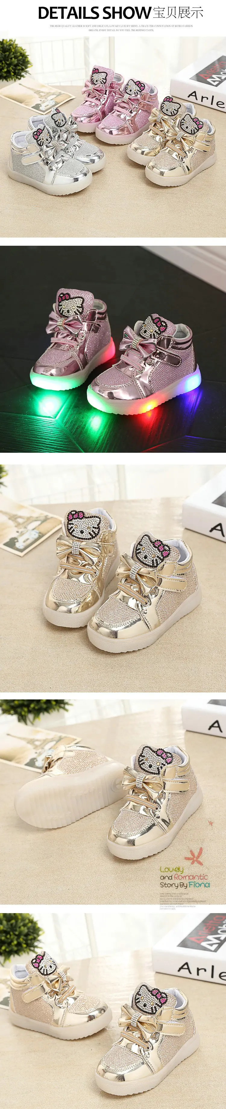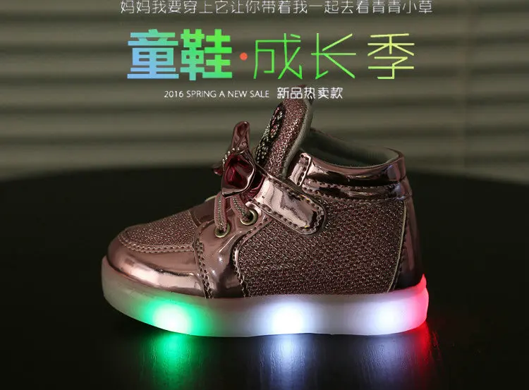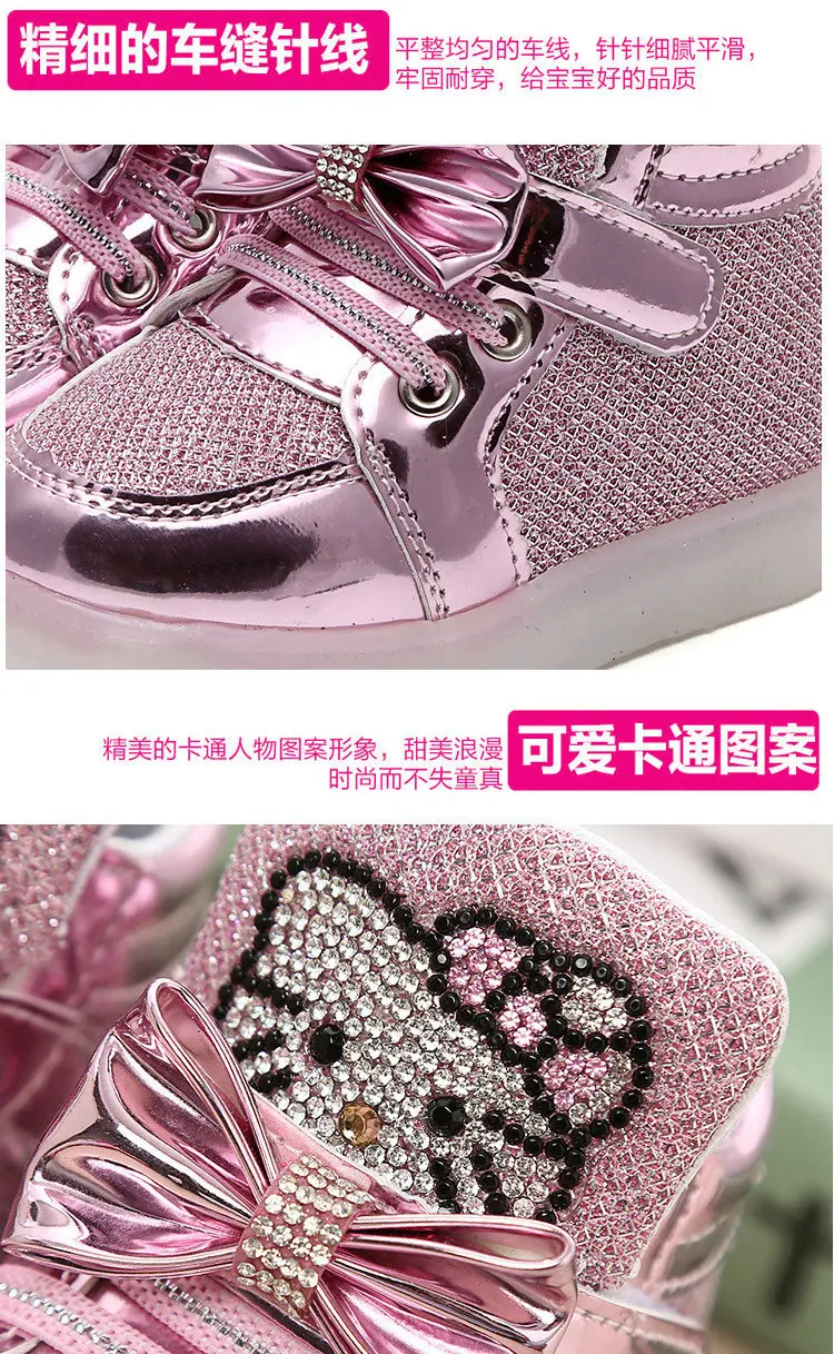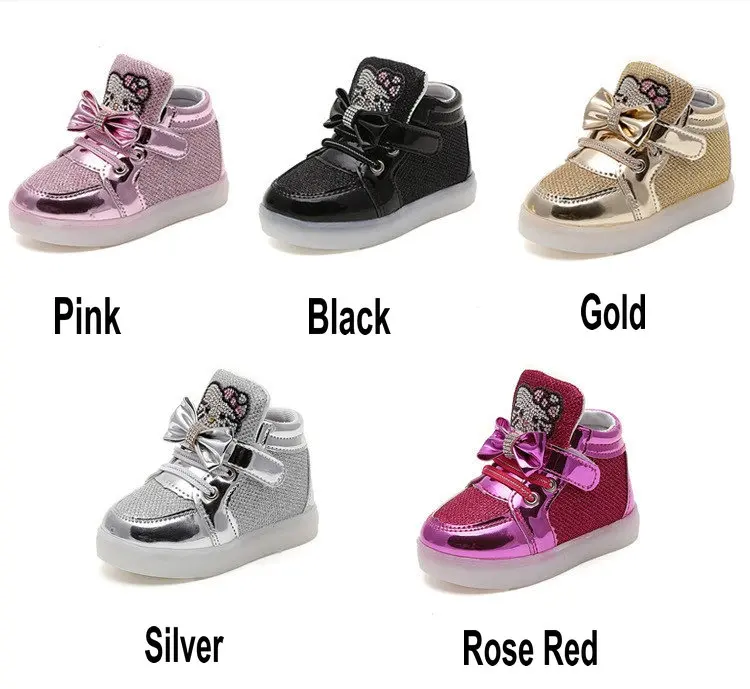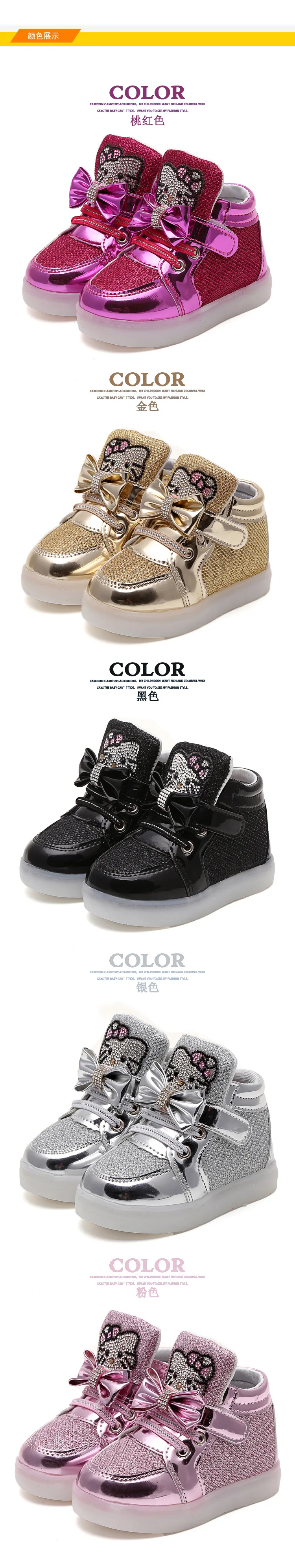 Children Cartoon KT LED shoes 2017 New Spring Kids breathable sports shoes girls flashing LED fashion glowing sneakers 21~36 Feature: Color:Black,Red,Gold,Silver,Pink Size:21~36 Length:13.5~22 cm Dear friends: Because all children shoes size is difference,When you order the children’s shoes,you should according to Our size and internal length. According to the Insole length.(Insole length=Foot length +1cm) The US size is Not Standard ,Just convenient for you to do order. The comfortable length is the foot length add about 1cm. And Because of the long time delivery time by China Post Air Mail and child will grow up fast please choose more bigger size shoes for your child. Please choose the right size. All shoes will be shipped with bubble bags,no boxes !!!