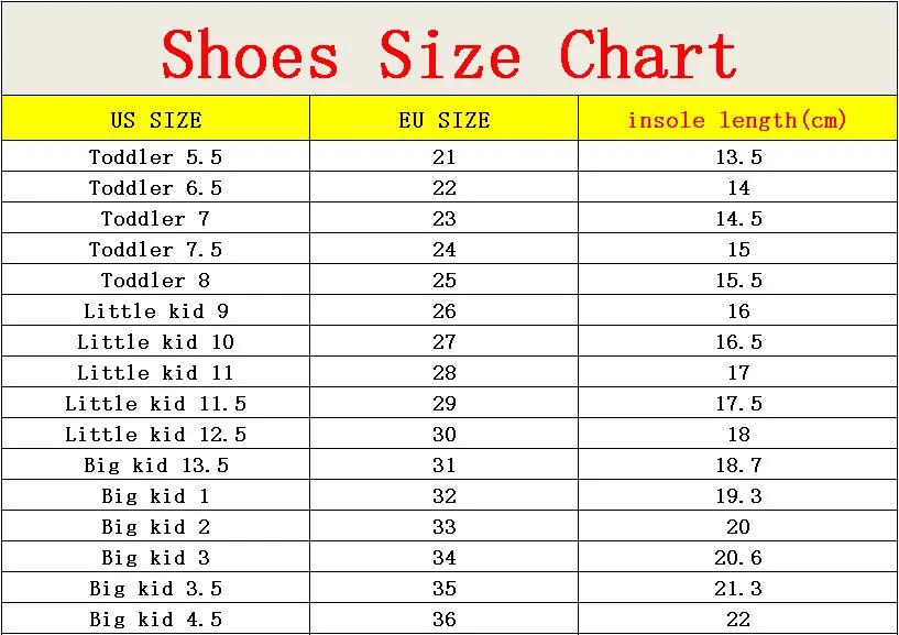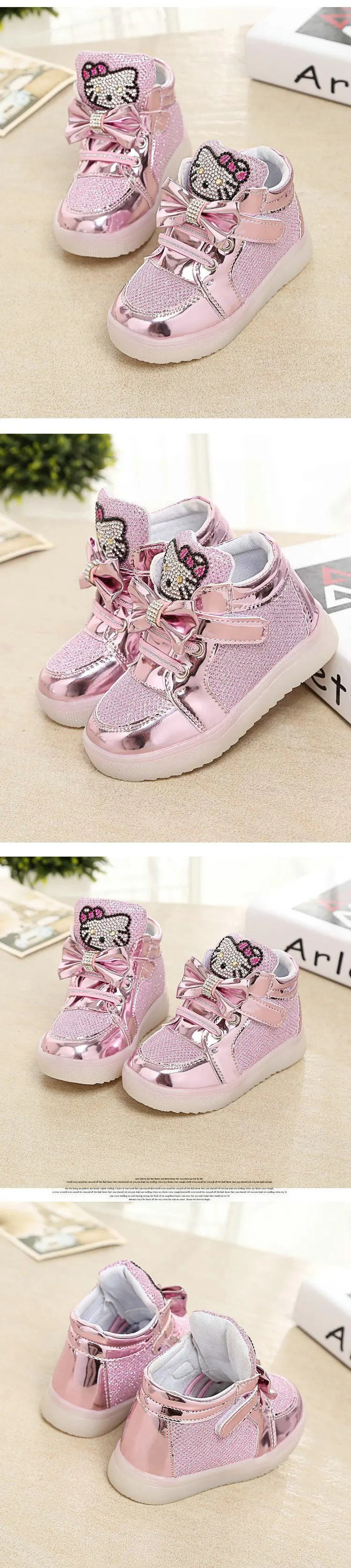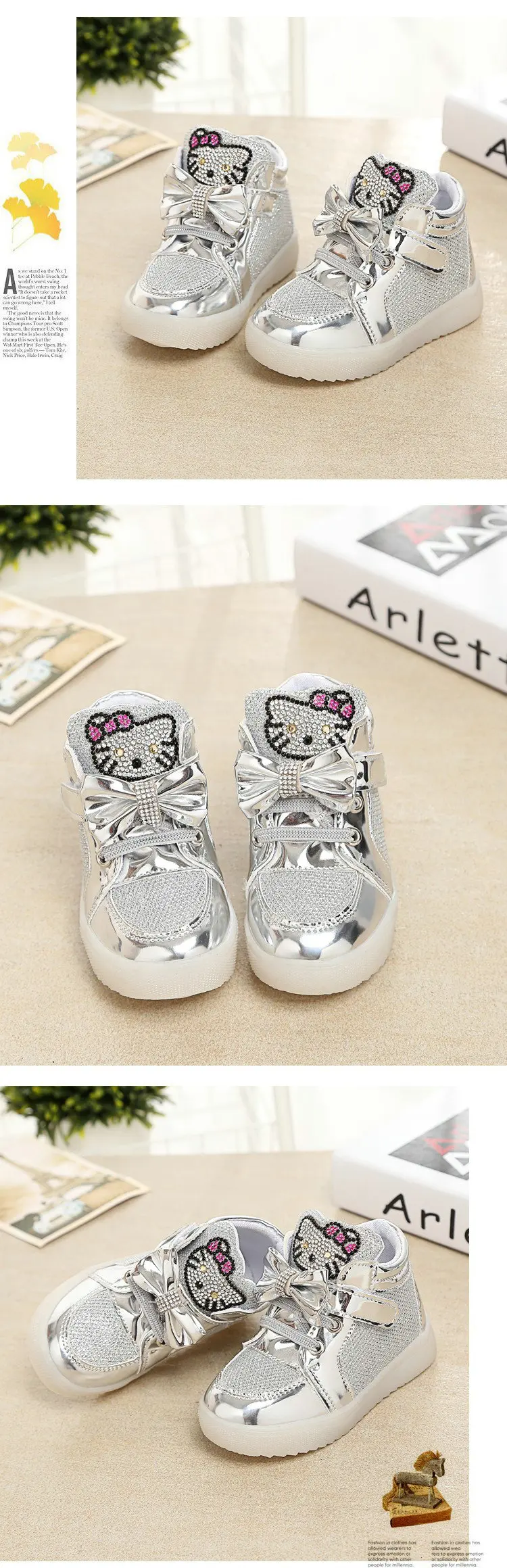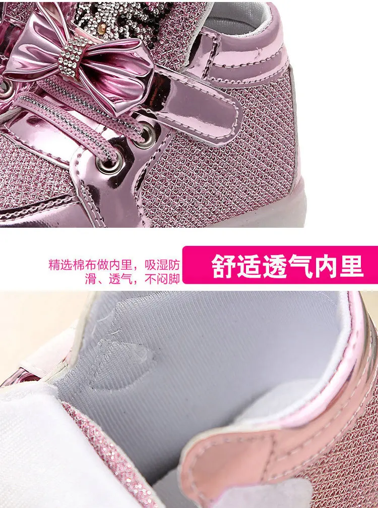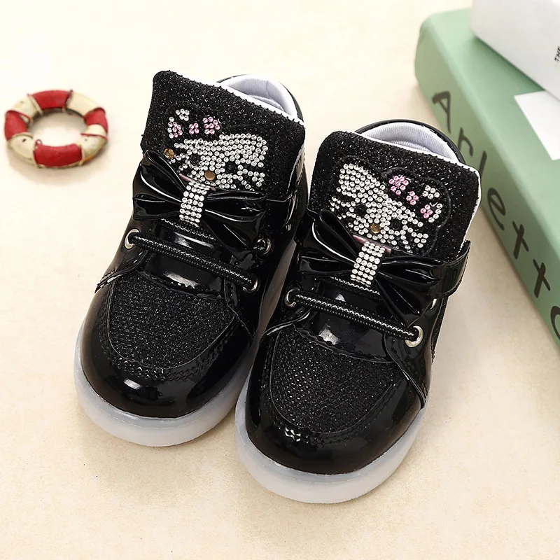 Children Cartoon KT LED shoes 2017 New Spring Kids breathable sports shoes girls flashing LED fashion glowing sneakers 21~36 Feature: Color:Black,Red,Gold,Silver,Pink Size:21~36 Length:13.5~22 cm Dear friends: Because all children shoes size is difference,When you order the children’s shoes,you should according to Our size and internal length. According to the Insole length.(Insole length=Foot length +1cm) The US size is Not Standard ,Just convenient for you to do order. The comfortable length is the foot length add about 1cm. And Because of the long time delivery time by China Post Air Mail and child will grow up fast please choose more bigger size shoes for your child. Please choose the right size. All shoes will be shipped with bubble bags,no boxes !!!