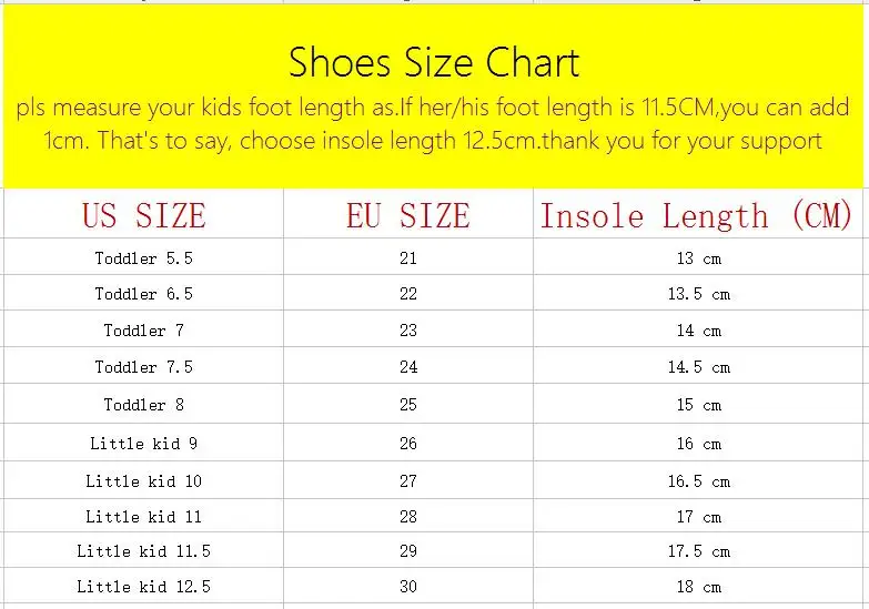 Because all children shoes size is difference,When you order the children’s shoes,you should according to Our size and internal length.