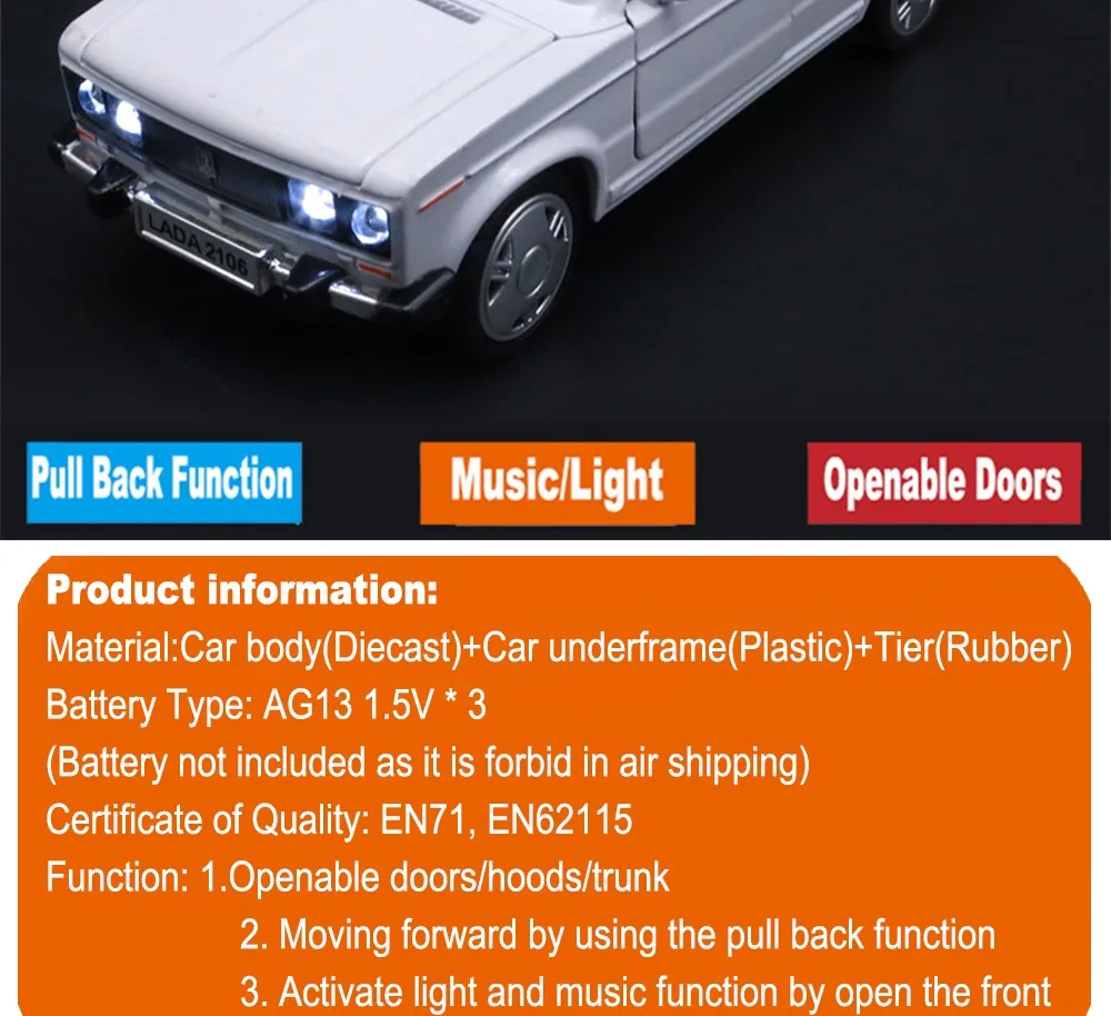 | Features | Diecast, Musical, Mini, Pull Back, Electronic, Model, Flashing |