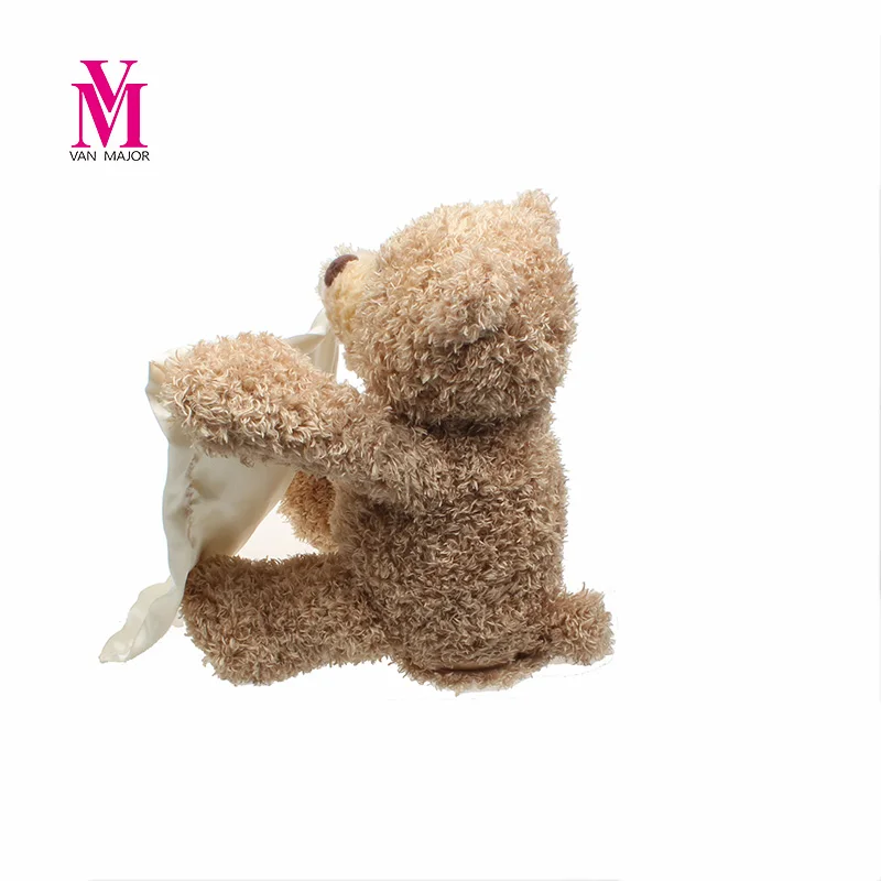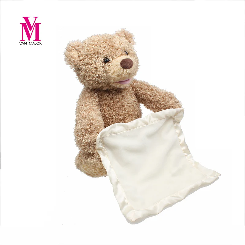 Peek-A-Boo Bear features a moveable mouth and arms. At the push of a button, the bear recites one of six different phrases and hides behind the blanket before popping back out to delight baby with an interactive game of peek-a-boo.