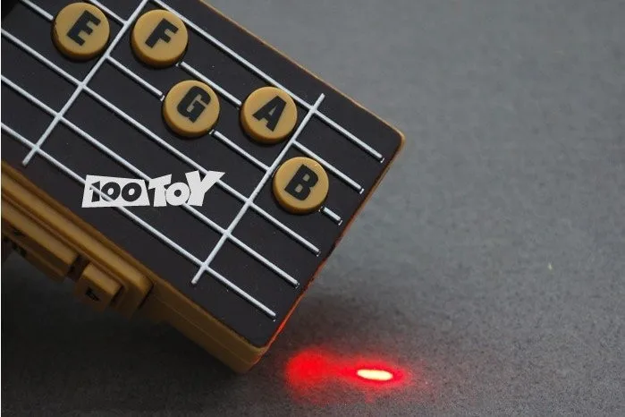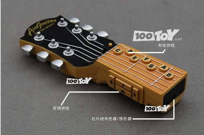 This is just the upper neck of an electric guitar, and the strings are the infrared ray that makes the sound as your fingers hit the fretboard. The controller has seven buttons on the front to click for “G” to “A” and four buttons on the side to identify the chords as major, minor, augmented or diminished. It also includes ten songs for air guitar beginners. Works with two AAA batteries (not included).