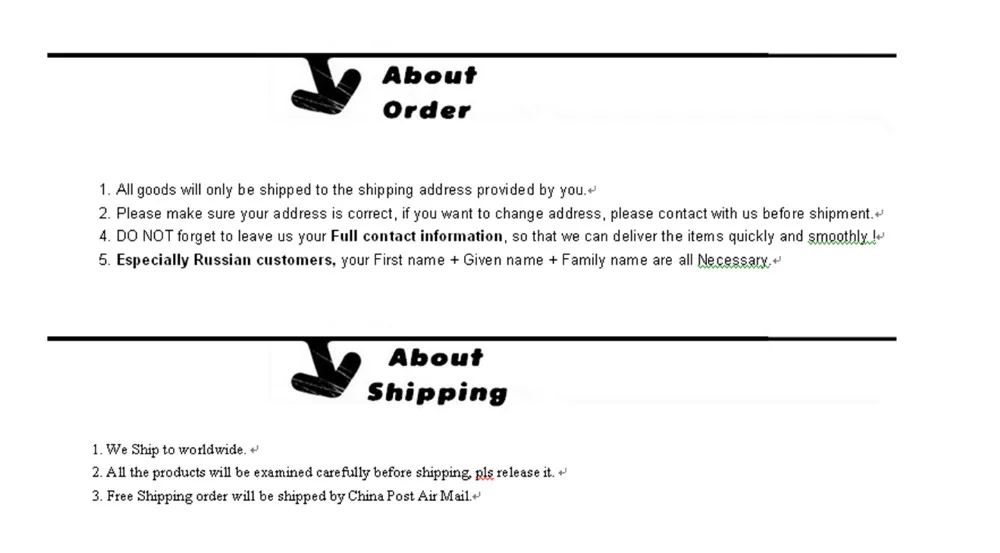 Dear Customer: 1)Please be sure that we’ll ship the goods out within 1-3 days,although we can’t be on line all the time due to the time zone. 2)Try to avoid probable taxes,packages mark with ‘gift’ and set the value as … Read More