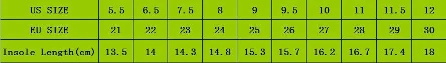 The US size is not the shoes of the standard size. US size only For buyers to purchase use . The buyers buy the right shoes according length of child’s feet, The size you need=length of your child’s feet+0.8~1.5cm Please choose the bigger size for the children’s feet grow very fast, and you need some time to receive the shoes The shoes comes without box