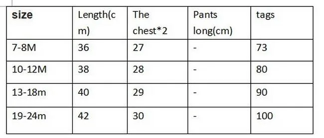 Kids US Size Clothe Length (cm) clothes Chest (cm) Sleeve Length (cm) Tag Size Suitable Height (cm) 6-9M 35 32 25 80/S 66-73 9-12M 37 33 26 90/M 73-80 12-24M 40 35 29 100/L 80-90 Please allow 1-3CM differences due … Read More