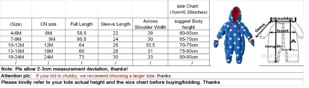 2017 Hot New Pattern Winter Baby Romper Newborn Colorful Warm Autumn Overalls Baby Snowsuit Hot Baby Suit Cute Hooded Baby Jumpsuit Romper -100% brand new and high quality -Shell: cotton + polyester blended Windcheater soft microfiber peach. -Lining: appr.220gsm Velvet/fleece -Padding/Filler: Cotton silk wadding -Garement weight: appr. 560g – 650g per piece Size 6M fit for baby growth 60-65M, size 9M fit for baby growth 65-70cm, size 12M fit for baby growth 70-75cm, size 18M fit for baby growth 75-80cm, size 24M fit for baby growth 80-90cm, It is for your size choosing reference, if you have any question, pls feel free to contact us!