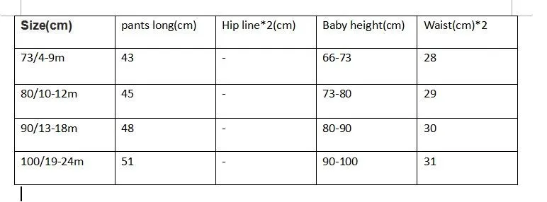 Unit:CM,1cm=0.4inch size length waist/2 80/10-12 months 43 18 90/13-18 months 47 19 100/19-24 months 51 20