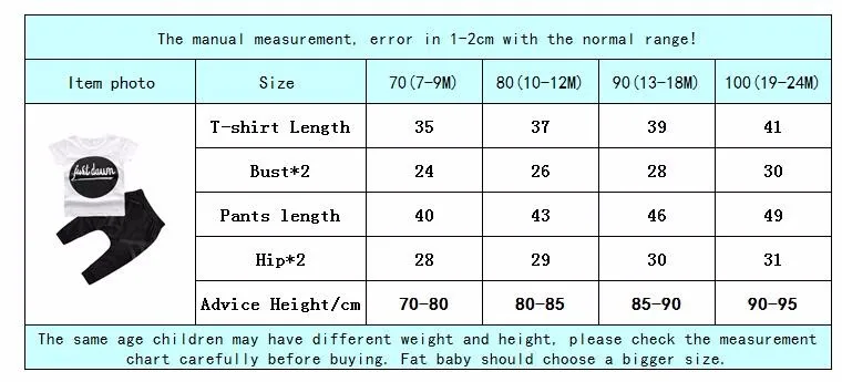 Size:70-80-90-100 Component: cotton 1 set=t-shirt+pants MOQ:1 sets Packaging: 1 set packed in 1 bag All units are centimeters/cm which measured by manual,ple allow tolerance at 1-3 cm