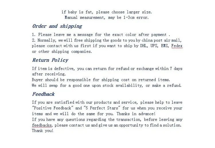 If you are satisfied with our products and service, please help to leave “Positive Feedback” and “5 Perfect Stars” for us when you receive your items and we will do the same for you. Thanks in advance!
