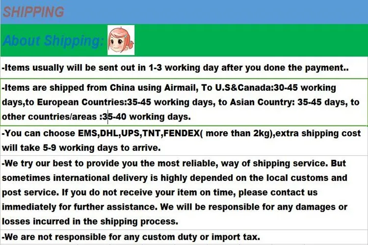 2. Normally, we will free shipping the goods to you by china post air mail, please contact with us first if you want to ship by DHL, UPS, EMS, Fedex or other shipping companies.