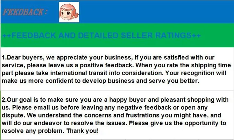 If you have any questions regarding the transaction, before leaving any feedbacks, please contact us and give us an opportunity to find a solution. Thank you!