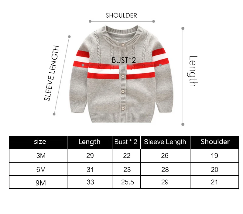 Item Name : Baby Sweater Color: Gray / Navy / Yellow / Red / Beige Size: 3M 6M 9M Collar : O- Neck Sleeve Length: Full For Season: Spring Autumn