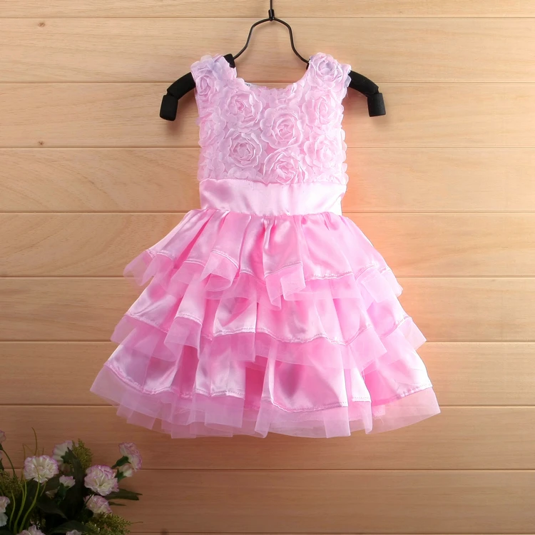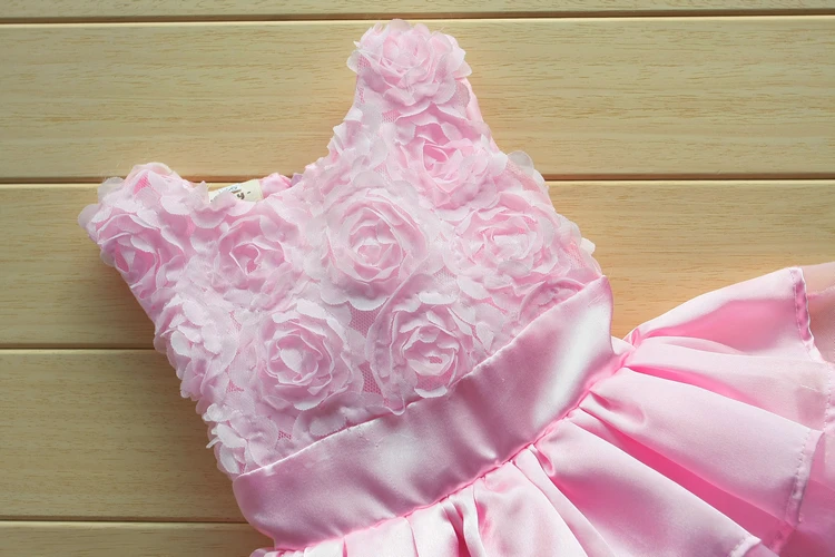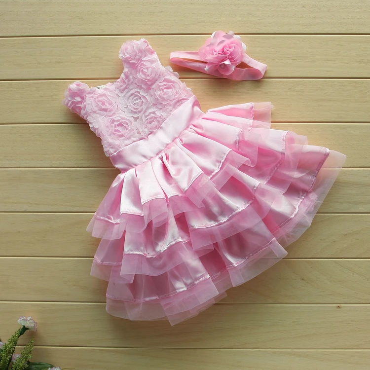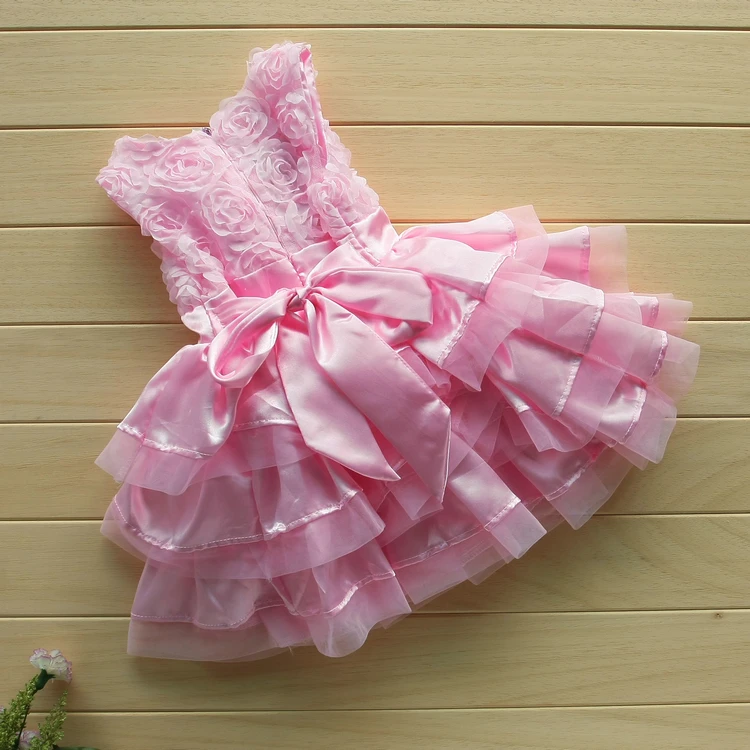 Rosette accented bodice, three-layer skirt that trimmed with tulle cascading from the waist.