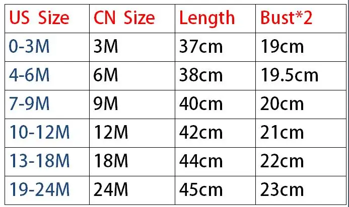 USD 5.39/set USD 5.09/piece USD 5.27/piece USD 5.59-6.39/piece USD 5.91/set USD 4.49-4.96/piece USD 5.99-6.74/piece USD 5.00/set Note:there may be 1-3cm error. 12M/80 Length 41CM Bust/2 24cm 18M/90 Length 44CM Bust/2 26cm 24M/100 Length 47CM Bust/2 27cm