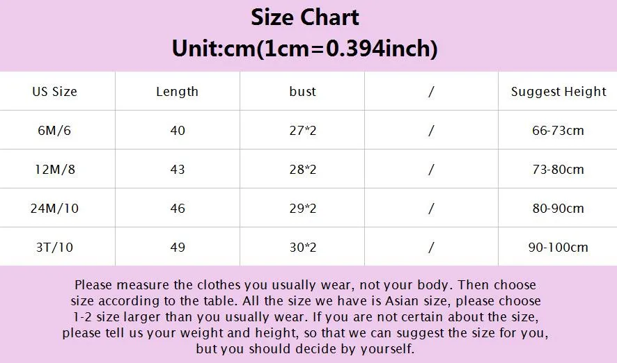 USD 5.39/set USD 5.09/piece USD 5.27/piece USD 5.59-6.39/piece USD 5.91/set USD 4.49-4.96/piece USD 5.99-6.74/piece USD 5.00/set Note:there may be 1-3cm error. 12M/80 Length 41CM Bust/2 24cm 18M/90 Length 44CM Bust/2 26cm 24M/100 Length 47CM Bust/2 27cm