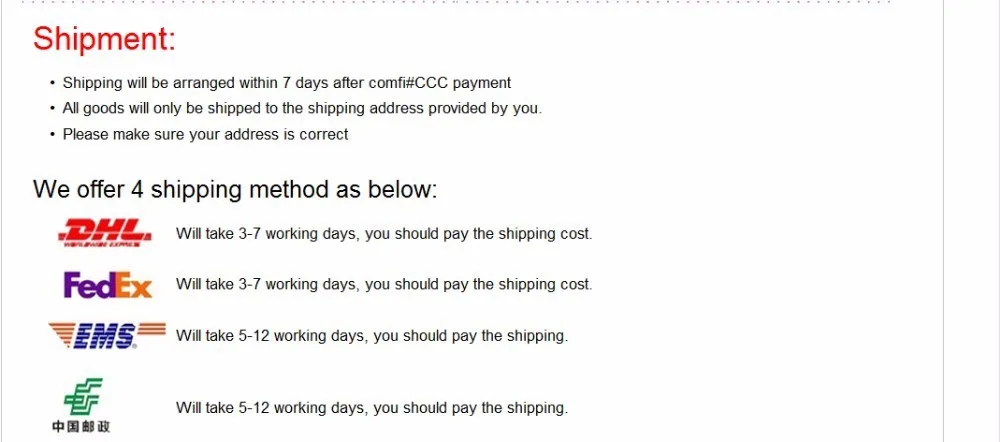 | Shipping | EMS, UPS, DHL, China air post, China post air mail also supported to Russia,Turkey,Brazil.ect |