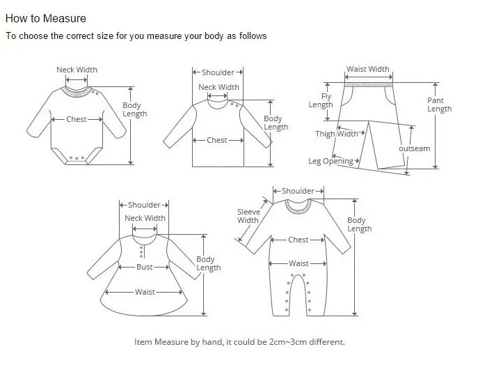USD 5.39/set USD 5.09/piece USD 5.27/piece USD 5.59-6.39/piece USD 5.91/set USD 4.49-4.96/piece USD 5.99-6.74/piece USD 5.00/set Note:there may be 1-3cm error. 12M/80 Length 41CM Bust/2 24cm 18M/90 Length 44CM Bust/2 26cm 24M/100 Length 47CM Bust/2 27cm