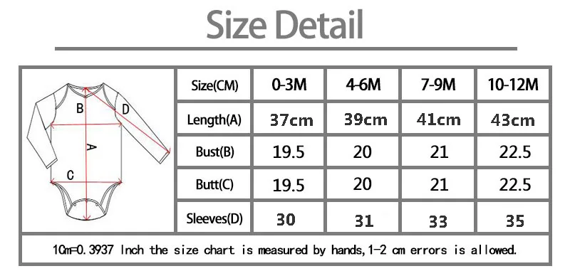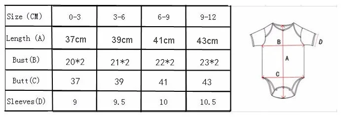 Specification: Size in age: 0-3M 3-6M 6-9M 9-12M Color: As the picture Fabric: 100% cotton Notice: Friend , our rompers size are in standard US size . 0-3 M clohtes length is about 36 cm , 4M-6M clothes is about 37-38 cm length, 7M-9M clothes is about 40cm length , 10M-12M clothes is about 41cm-42cm length . All our clothes are made with 100% cotton . The fabric is very soft . The print color is not very bright. Because our printing is environmentally friendly, printing on those clothes is harmless to baby. Sizes Details