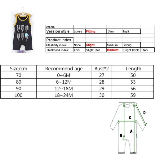 Features: 100% brand new and high quality Ice cream style, with fun and joy Baby between 0-24Months recommended Romper only, any not included Material: Cotton Color: Dark grey Size: 70/80/90/100 Size/cm Recommend age Bust*2 Length 70 0~6M 27 50 80 6~12M 28 53 90 12~18M 29 56 100 18~24M 30 59 Note: 1. The recommended age is just for your reference. Please check the measurements to choose the right size for your baby! Meanwhile, please choose the larger size because babies at the same age may have different height. 2. Please allow 1-3cm (0.4-1.18″) difference due to manual measurement and slight color variation for different display setting Thank you and nice day!~ Package Includes: 1 x Romper Attention plz: If your kid is chubby, we recomend choosing a larger size, thanks.