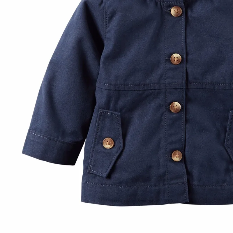 Faux-wood button front design__Front pockets__Contrast velveteen tape at inside neckline