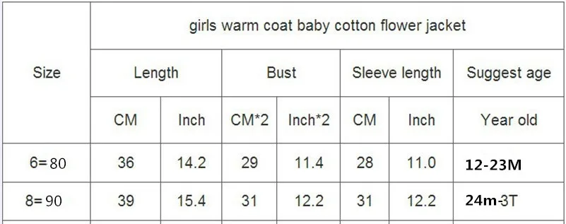 TIPS: Because Measured by hands,maybe there will be 2-3cm deviation.we hope the customer can understand it.Many thanks! If baby is fat,please choose bigger size Package : Coat *1piece