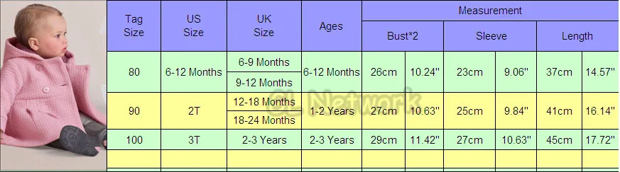 – Material: Cottton&Polyester       – Features: Soft cotton material! High quality,warm, comfortable and breathable. fashionable design. very special. this overcoat is relatively thick. it is made of cotton.it is suitable for your baby to wear in spring and autumn and the beginning of winter.           Size Chart: