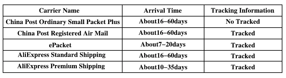 Order less than (<) $5, we will ship out by China Post Ordinary Small Packet Plus. Have Logistics Information in China,have’t outside China. Order more than (>) $5, we will ship out by China Post Registered Mail or ePacket, Whole process has information.