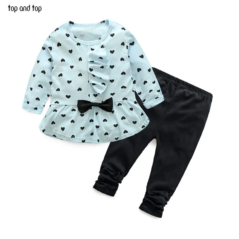 2017 New Baby Girl Set Heart-shaped Print Bow Cute 2PCS Kid Set T shirt + Pants Cute Princess Kids Clothing Set Newborn Clothing