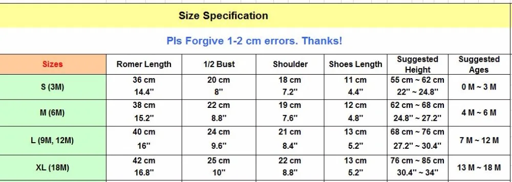 Size: S(3M), M(6M), L(9M, 12M), XL(18M) Suit for 0-2 years baby (Only for reference)