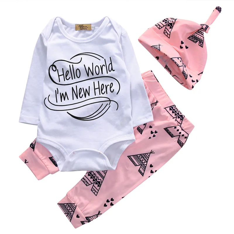 Newborn Baby 3pcs Tops Romper Clothes Sets Long Sleeve Hello World Autumn Clothes Wear 3PCS Cute Boy Girls Boutique Outfits