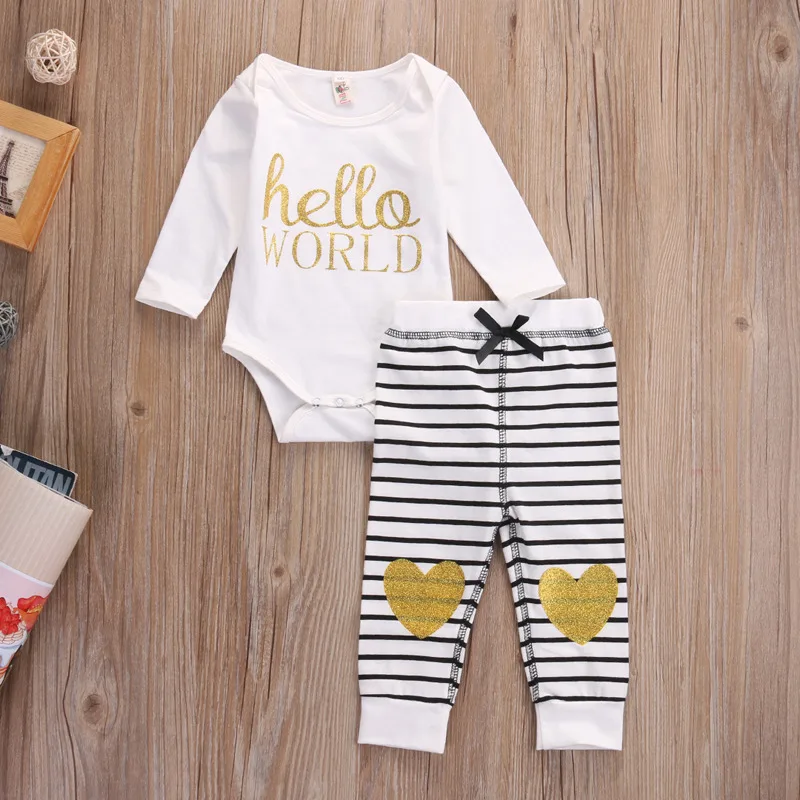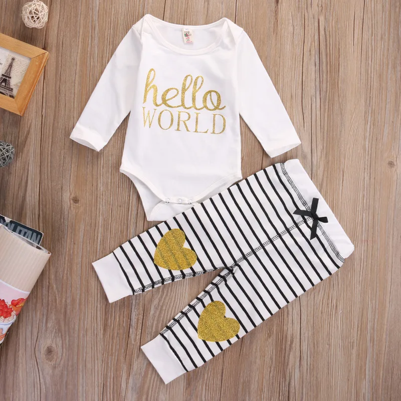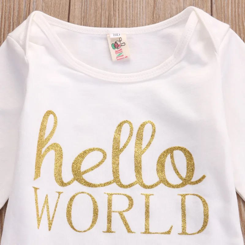 Newborn Baby Girls Clothing Set Hello World Tops Bodysuits + Long Pants 2Pcs Baby Girl Outfits Set Clothes Description