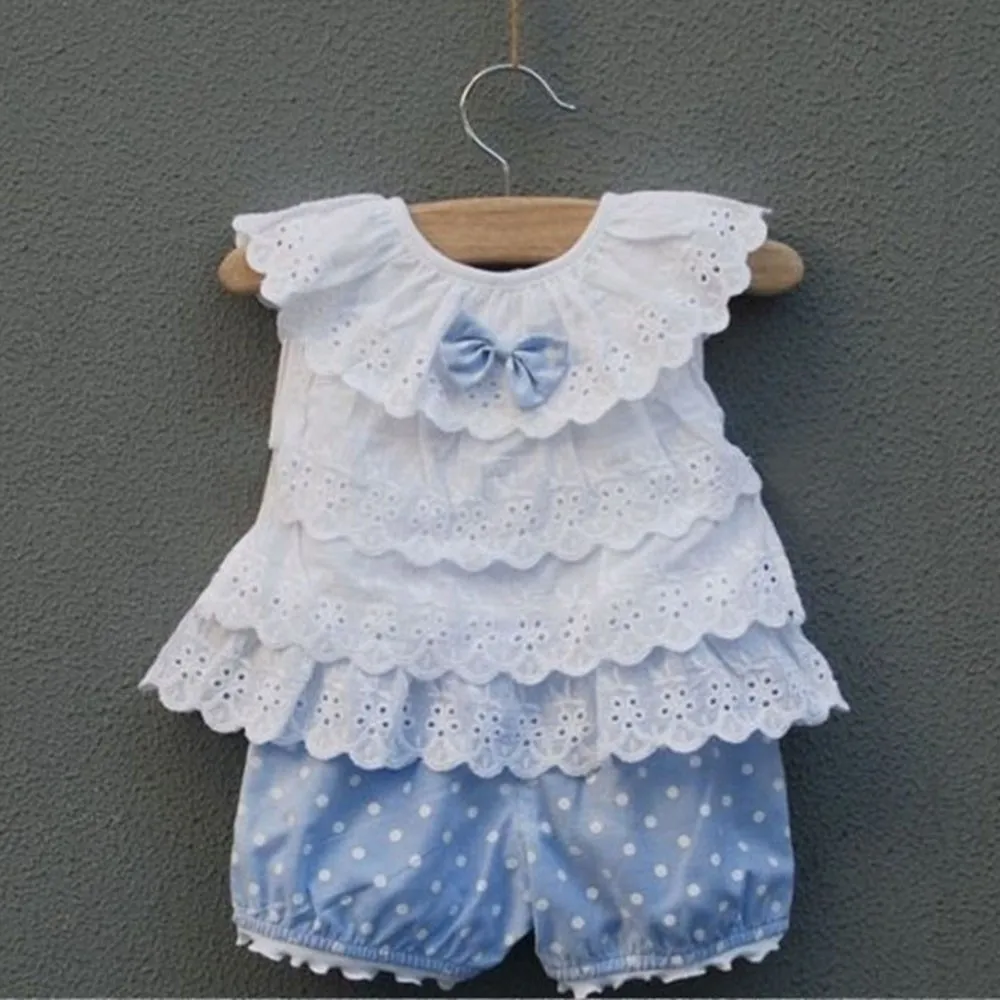Style: Baby Girls Hollow Out Ruffled Lace Neck Tops Shorts Sets