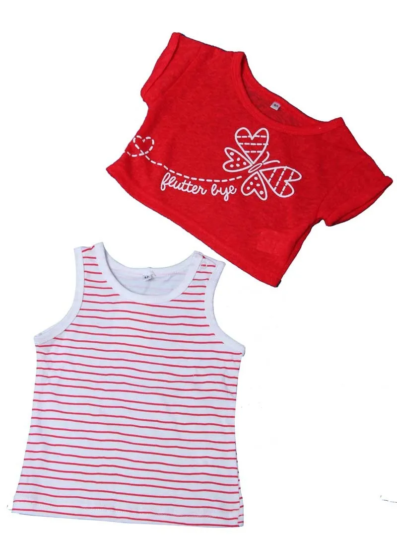 This New Design Hot Selling Unisex baby T-Shirt Set,two pieces summer baby girl set, we have three colors for you to choose, striped vest with a short T- shirt outside, beautiful but elegant. The striped vest is made of Pure Cotton which is breathable, light and comfortable. The material of the outside T- shirt is stretchable, breathable, it is a perfect practical and beautiful combination.