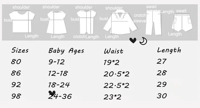 Specification: Size in age: 10-12M 13-18M 19-24M 24M Size in height:80-86-92-98 Color: As the picture Fabric: 100% cotton Sizes Details