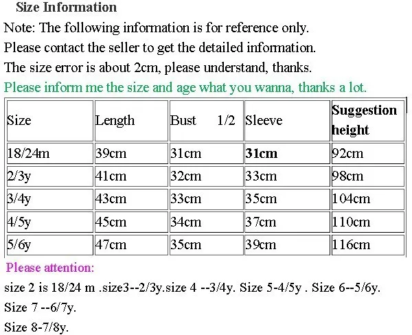 Size(cm) Waist(CM) long(cm) Advise Years 2T 70 43 1-3Y 4T 70 46 3-5Y 6T 76 47 5-7Y 8T 84 52 7-9Y Each person measurement, please allow 2CM error