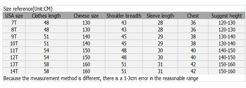 Tag Size 90 100 110 120 130 US Size 2T 3T 4T 6T 8T Length (cm) 37 40 43.8 47 48 Chest (cm) 65 68 70 76 78 Sleeve (cm) 32 36.4 40 43.5 49 Shoulder (cm) 27 28.5 29.5 … Read More