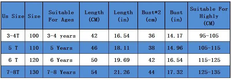 Tag Size 100 110 120 130 140 US Size 3T 4T 6T 8T 10T Length (cm) 38 40 42 45 47 Chest (cm) 68 72 74 76 78 Sleeve (cm) 24 27 29 31 33 Shoulder (cm) 29 31 32 … Read More