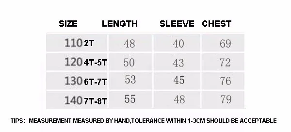 Tag Size 100 110 120 130 140 US Size 3T 4T 6T 8T 10T Length (cm) 38 40 42 45 47 Chest (cm) 68 72 74 76 78 Sleeve (cm) 24 27 29 31 33 Shoulder (cm) 29 31 32 … Read More