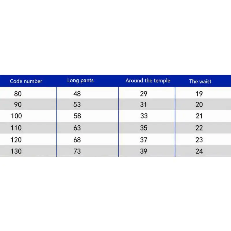 Size———–Length————Waist————-Age 3T 80———45cm/17.71″——-38cm/14.96″—–2-3Y 4T 90———49cm/19.29″——-42cm/16.53″—–3-4Y 5T 100——–55cm/21.65″——-44cm/17.32″—–4-5Y 4T 110——–60cm/23.62″——-46cm/18.11″—–5-6Y 5T 120——–64cm/25.19″——-48cm/18.89″—–6-7Y