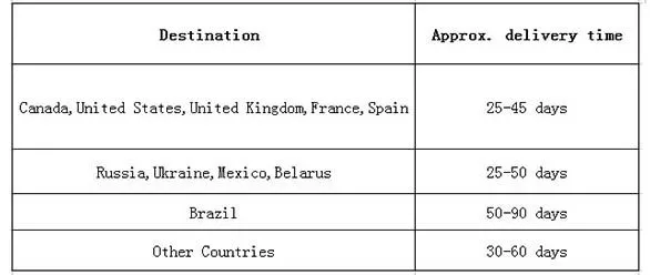 Shipping 1. Normally, the order will be sent out by China Post Ordinary Airmail within 7 days once your payment is confirmed and no tracking number is untracked.If you want to track the shipping infomation online,you should choose the Registered Airmail. 2. Below is approximately delivery time. Sometime the delivery time may be delayed which is out of our control,so please understand and wait patiently.